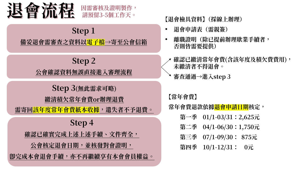 提醒:若欲辦理退費,所需工作天將大於5天,但不影響退會證明之開立。